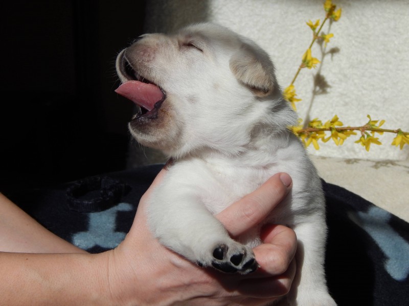 Pokusím se popsat, jak takové focení probíhá. Mrňouskové musí být najezení, vyprázdnění, poběhaní a tak akorát unavení, aby jim úplně nepadala hlava a zároveň nebyli příliš divocí. Vzhledem k otevřeným očičkám jim nemůžeme blikat bleskem a potřebujeme tedy sluneční světlo k dobrému nasvícení a rozlišení. Venku je pro ně ještě zima, musíme doma. Do toho spávného okna svítí v dobrém směru asi půl hodiny. Takže dva vysoké kulaté pelechy na sebe pro dobrou výšku, podklad a pozadí, ať se v barvách neztratí, malí zrovna odpadají a my se pokoušíme o rychloakci. Prckům se ani tohle světlo do očí nelíbí, rádi by si položili hlavičku ke spánku a většinu už si musím probudit a tak je různě přesvědčujeme, že focení je fakt super. Výsledek můžete posoudit v albu štěňátek a pro deníček vybírám nejpovedenější zívací.